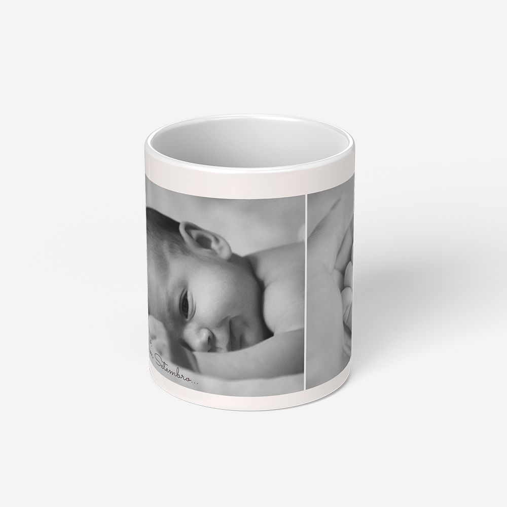A caneca mede 8 x 9,5 cm, com 100% da superfície personalizável, exceto a asa. A área de impressão permite criar um produto exclusivo com fotos, ilustrações ou textos.